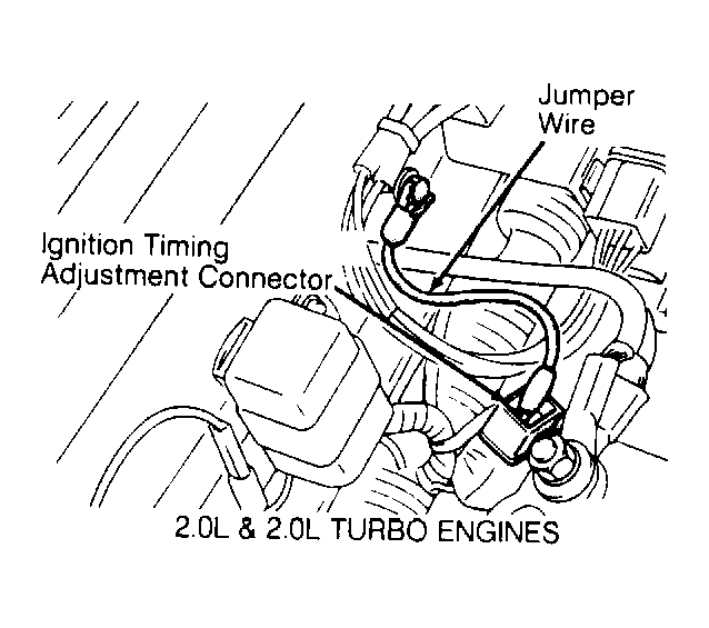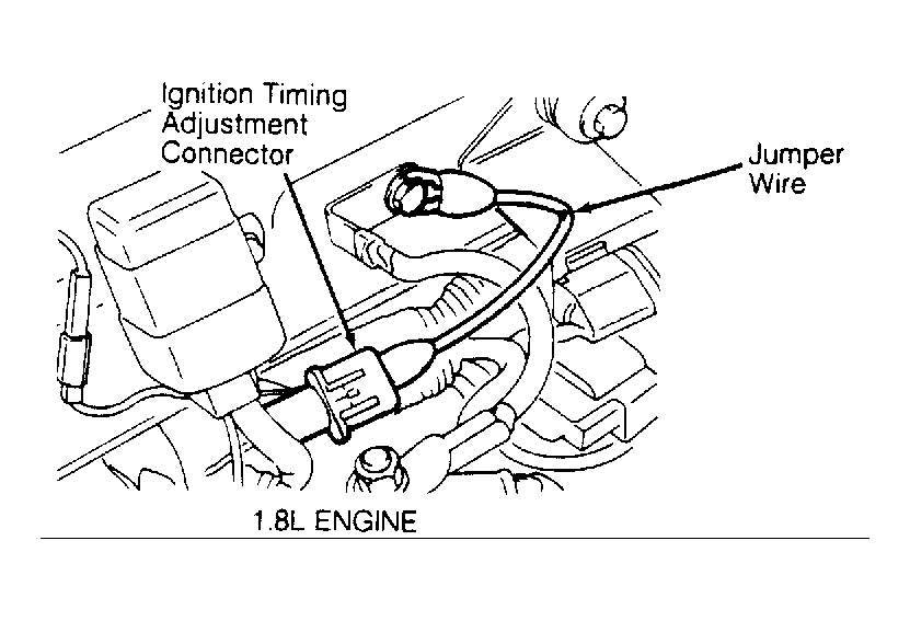 3. Using a jumper wire, ground ignition timing adjustment connector Yellow/Red wire. See Figure and Figure . Start engine. Check base ignition timing. Loosen distributor hold-down bolt and adjust as necessary. Disconnect ground wire on ignition timing adjustment connector. Check actual ignition timing. Turn engine off. Remove all test equipment.