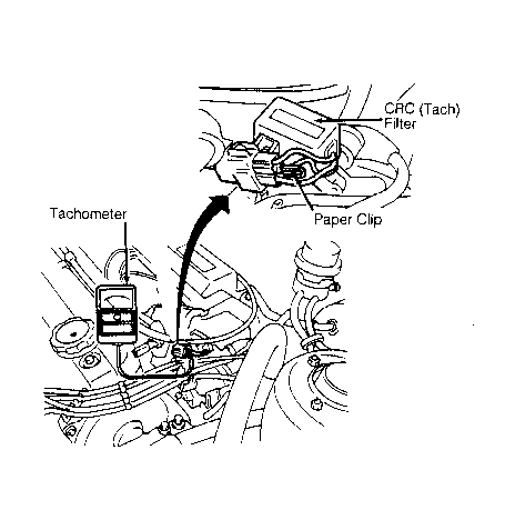 2. Insert paper clip in Crankshaft Revolution Counter (CRC or tachometer) filter connector and connect tachometer to engine. See Fig 1 . Ensure curb idle speed is set to specification. Turn engine off.