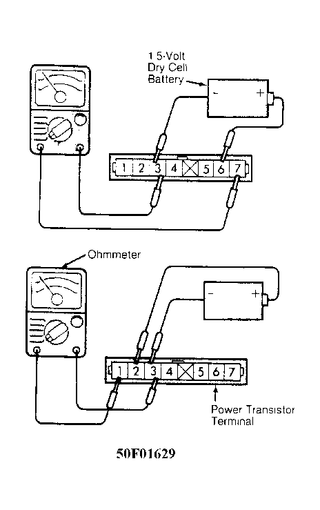 - Connect analog ohmmeter leads between power transistor terminals No. 3 and No. 7. Ohmmeter should indicate no continuity. Using a 1.5-volt dry cell battery, connect positive battery lead to power transistor terminal No. 3 and negative lead to terminal No. 6. See Fig 1