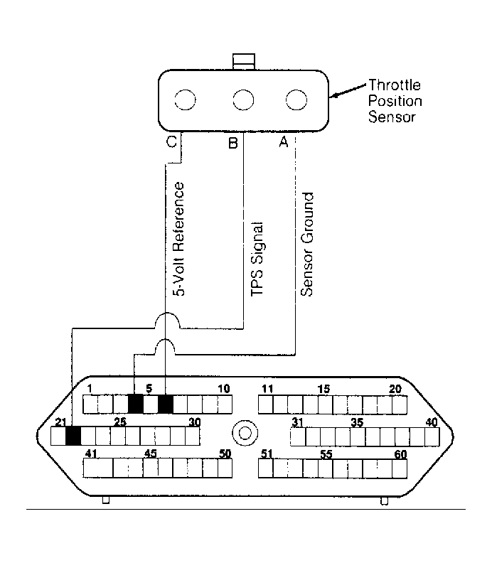 - Turn ignition off, and reconnect TPS. Backprobe TPS connector terminal "B" to ground. With ignition on, DVOM should indicate 0.5 volt at idle and should gradually increase to 4.5 volts at wide open throttle. Replace TPS if it does not test as indicated. TPS is not adjustable.