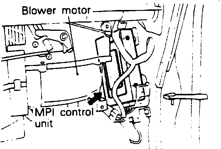 The electronic (MPI) control unit is located RH of the vehicle, behind the dash bolster, next to the right kick panel.