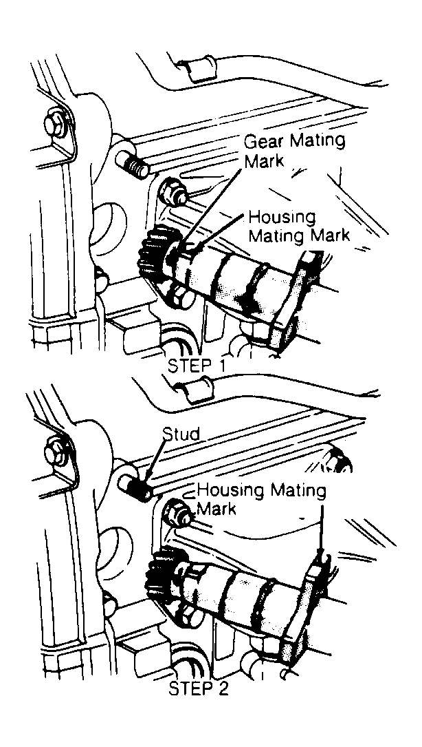 3. Install distributor to engine while aligning housing mating mark with center of distributor installation stud. Perform STEP 2. See Fig 1 .