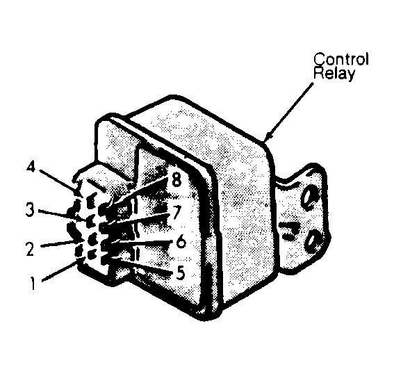 - While grounding terminal No. 5 and applying battery voltage to terminal No. 2, ensure there is 0 ohms resistance between terminals No. 1 and 4. Replace control relay if it does not test as described.