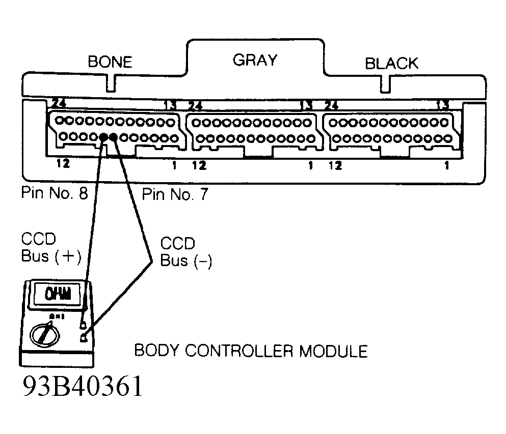 - If resistance is less than 5 ohms, check resistance of CCD bus negative circuit (White/Black wire) between PCM connector terminal No. 46 and data link connector.