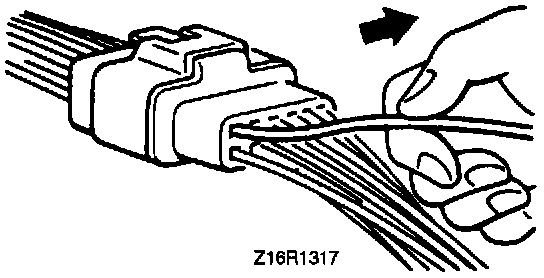 When the terminal stopper of connector is out of order, engagement of male and female terminals becomes improper even when the connector itself is engaged perfectly and the terminal sometimes slips out to the rear side of connector. Make sure that each terminal does not come off the connector by pulling each harness wire.