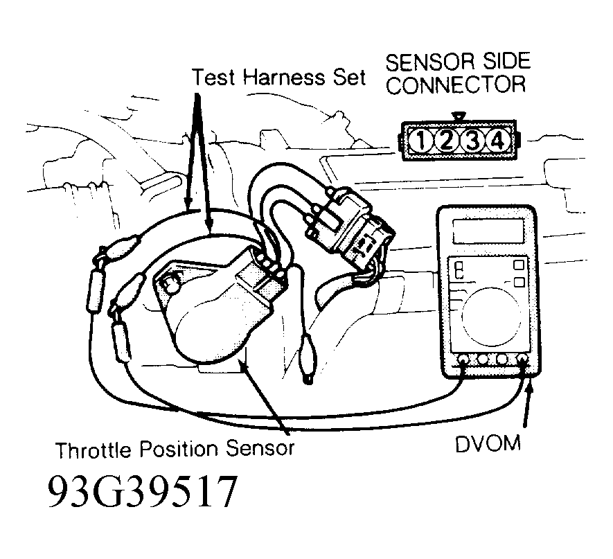 - Ensure basic idle speed is set to specification. See the IDLE SPEED SPECIFICATIONS table under IDLE SPEED. Install Test Harness Set (MB99138) between TPS and TPS connector. See Fig 1 . Connect Digital Volt-Ohmmeter (DVOM) between TPS output terminals No. 2 and 4. Turn ignition on. DO NOT start engine.
