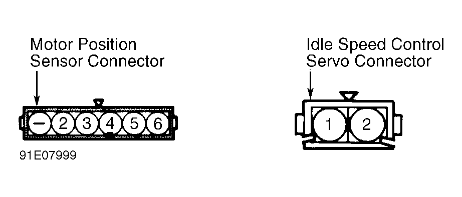 - Using an ohmmeter, check resistance between idle speed control servo connector terminals No. 1 and 2. See Figure . Ohmmeter should read 5-35 ohms at 68°F (20°C). Connect a 6-volt power source across idle speed control servo connector terminals No. 1 and 2. Idle speed control servo should operate. Replace idle speed control servo if it does not test as described.