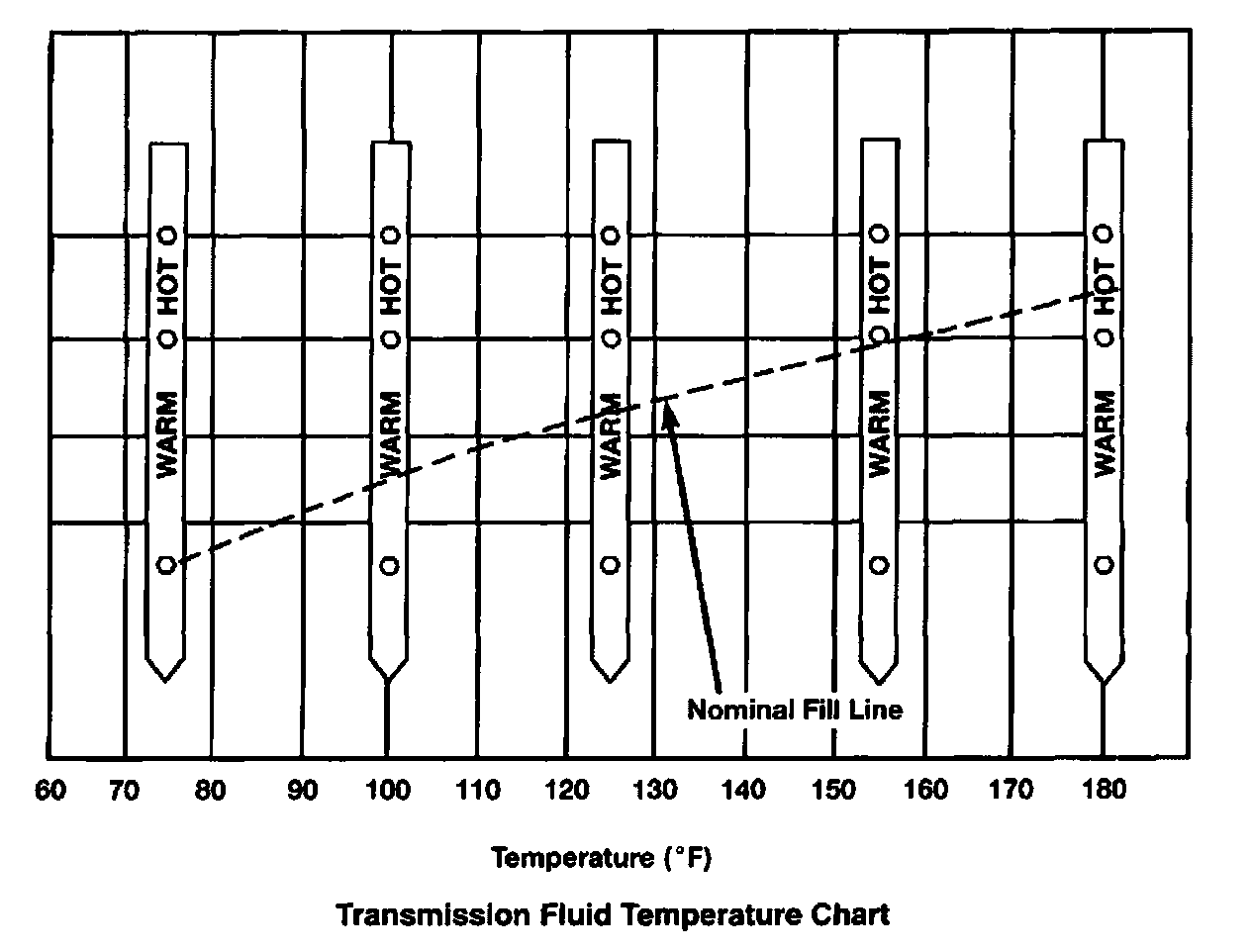 6. Adjust transmission fluid level shown on the dipstick according to the chart.