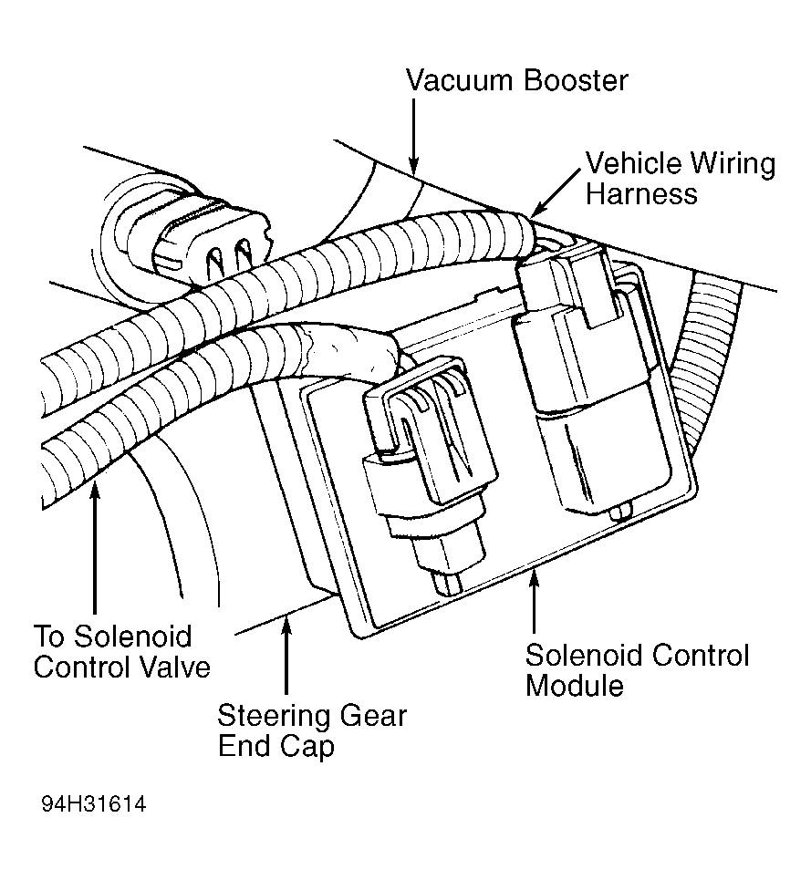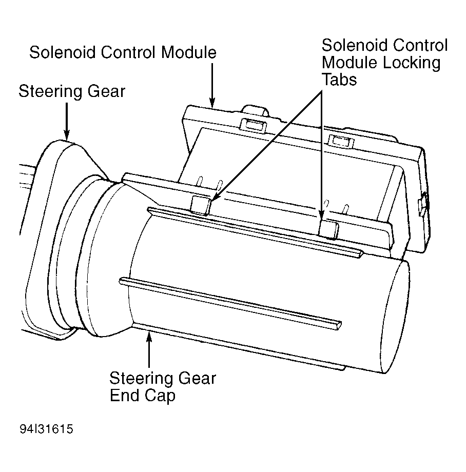Remove wiring harness connectors from solenoid control module. See Fig 1 . Depress 2 locking tabs on bottom of control module and rotate control module upward, until retaining tabs can be removed from steering gear end cap. See Fig 2 . To install, reverse removal procedure.