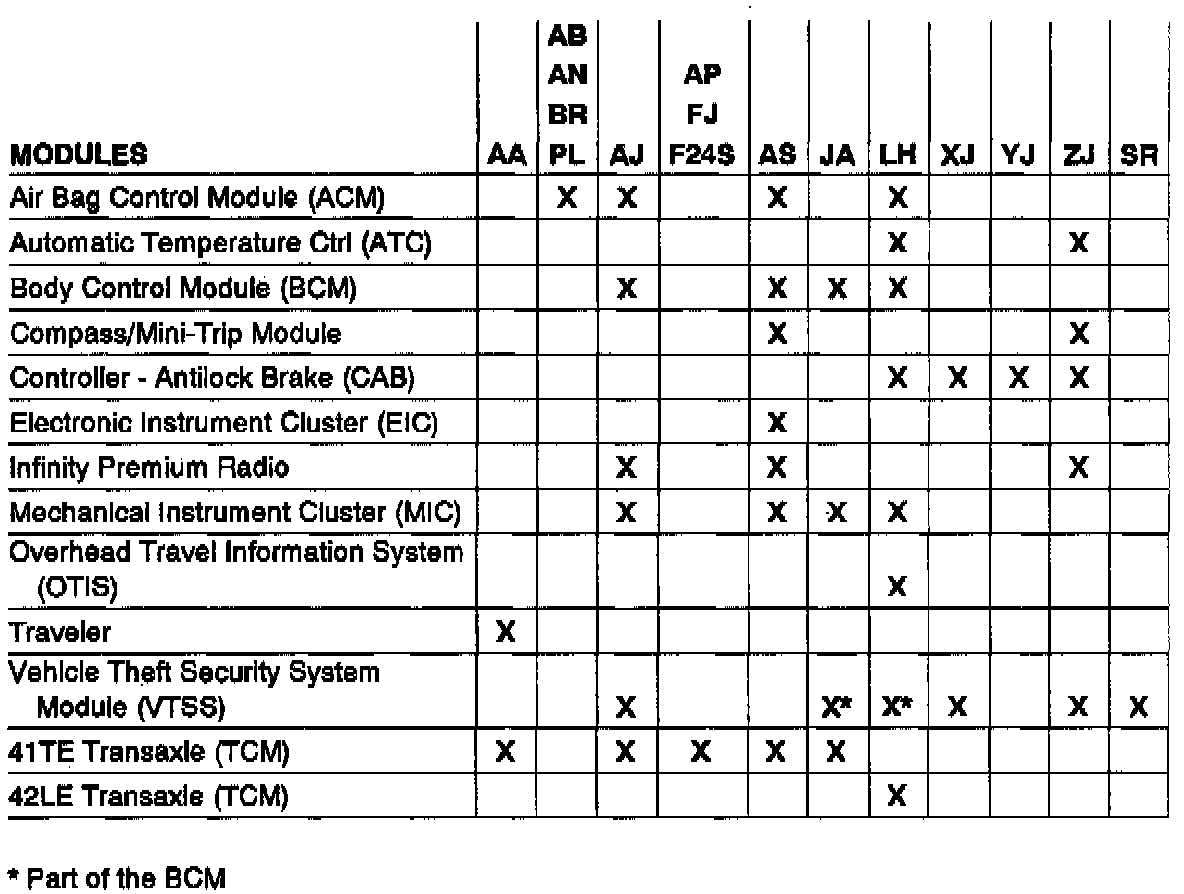 Some of the instructions tell you to disconnect a module that may not be available on this vehicle. Above is a matrix of modules and bodies showing the modules each vehicle is equipped with.