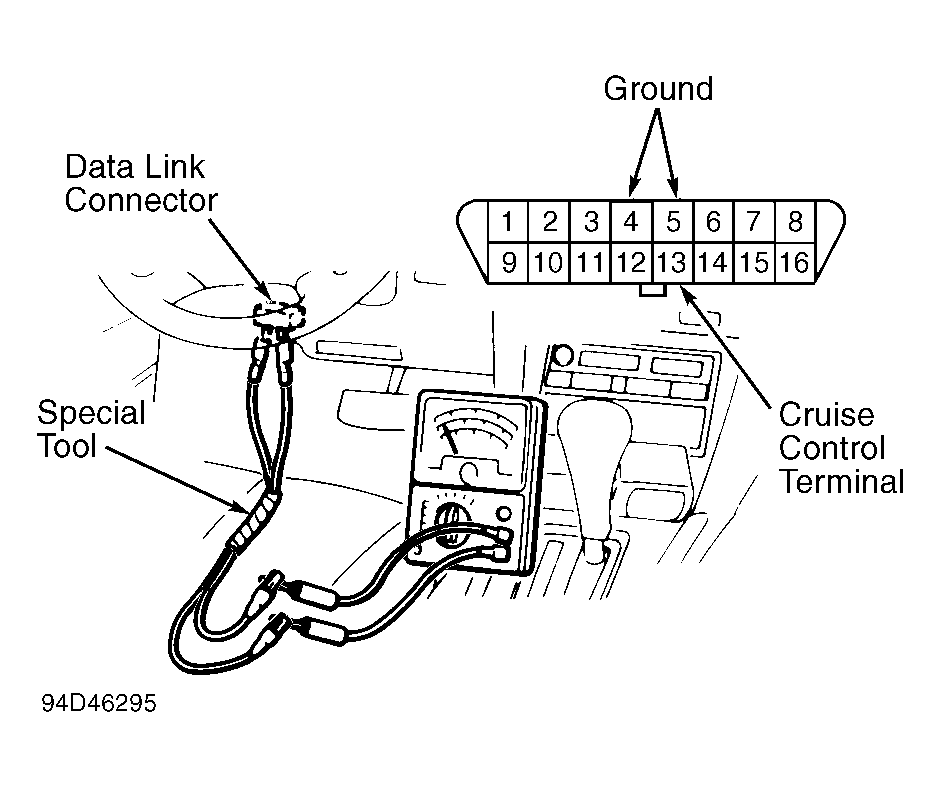 - If using voltmeter, connect leads of analog voltmeter between cruise control terminal and ground terminal of diagnostic connector. See Figure