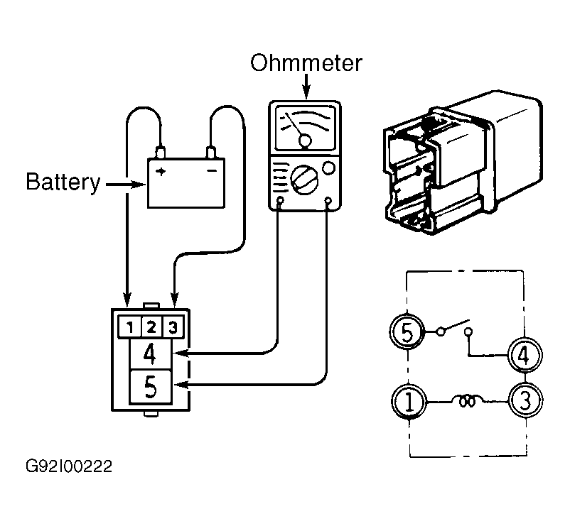 - Apply battery voltage to relay terminal No. 1, and ground relay terminal No. 3. Check for continuity between terminals No. 4 and 5. If continuity exists, relay is okay. If continuity does not exist, replace relay.