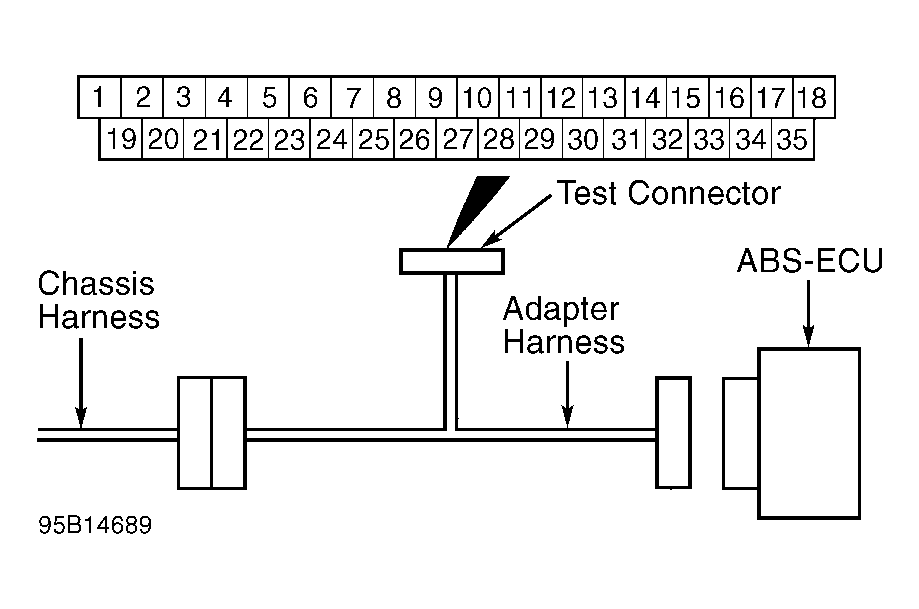 - To check voltage or resistance on ABS-ECU terminals, use Adapter Harness (MB991356). Terminal arrangements on ABS-ECU and special tool will be reversed. Use terminals from special tool when testing (for example, for testing ABS-ECU connector terminal No. 18, use terminal No. 1 on special tool). See Fig 1 .