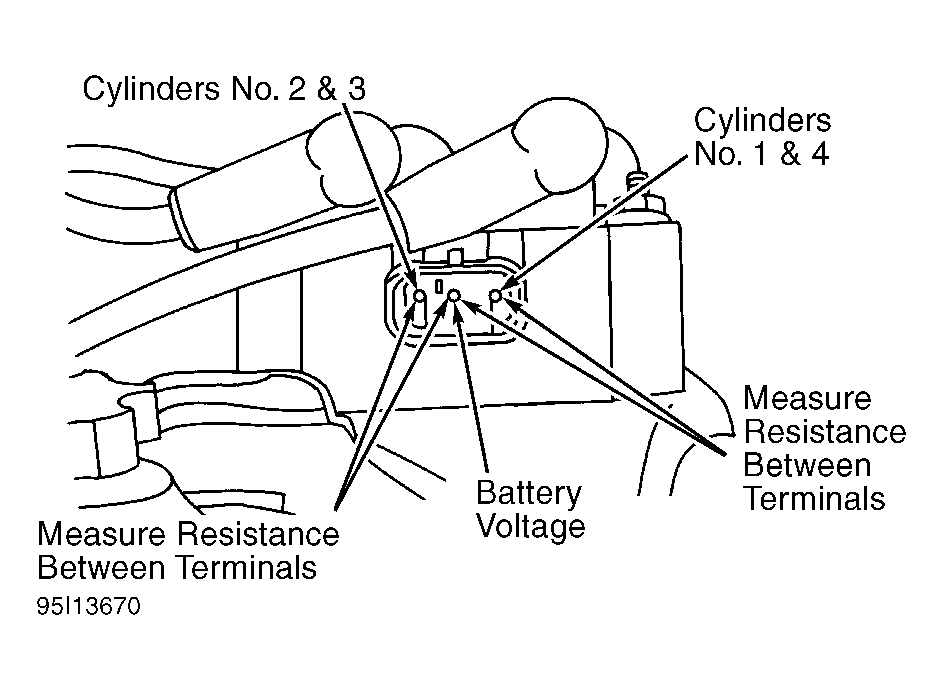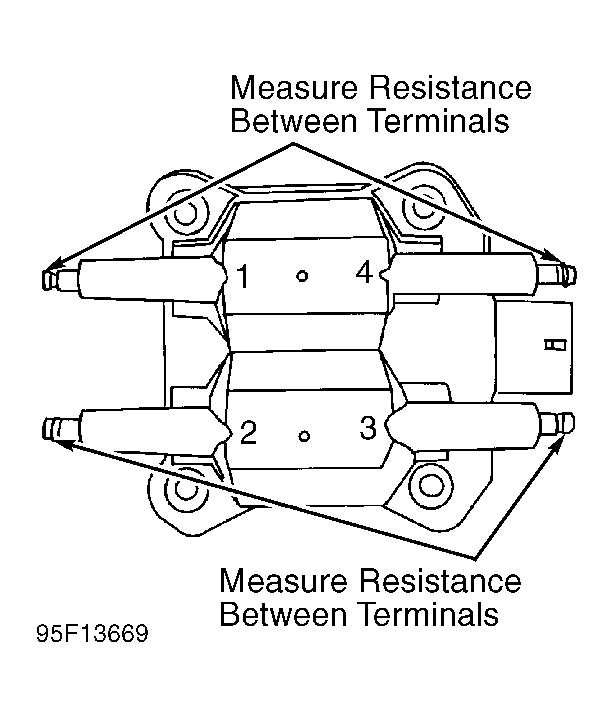 - Turn ignition off. Disconnect ignition coil electrical connections. Using a DVOM, measure resistance of primary and secondary coil circuits. Measure primary circuit resistance between battery terminal and terminal for cylinders being checked. See Fig 1 .
