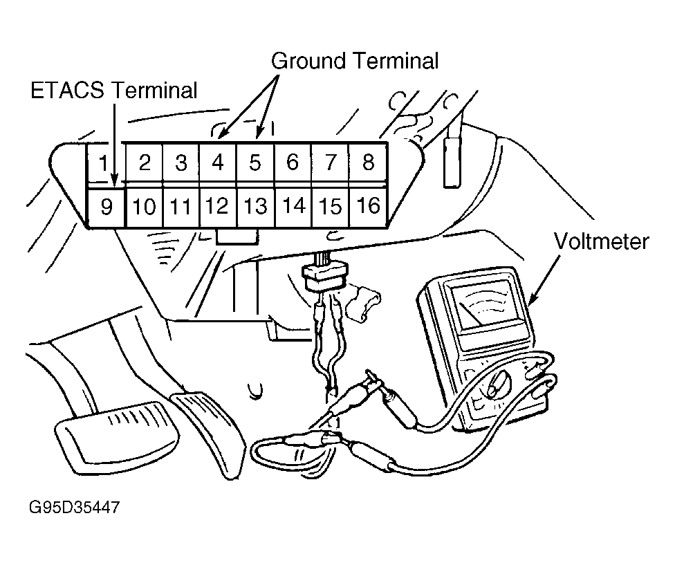 - Connect voltmeter to Data Link Connector (DLC) ETACS terminal and ground terminal. See Fig 1