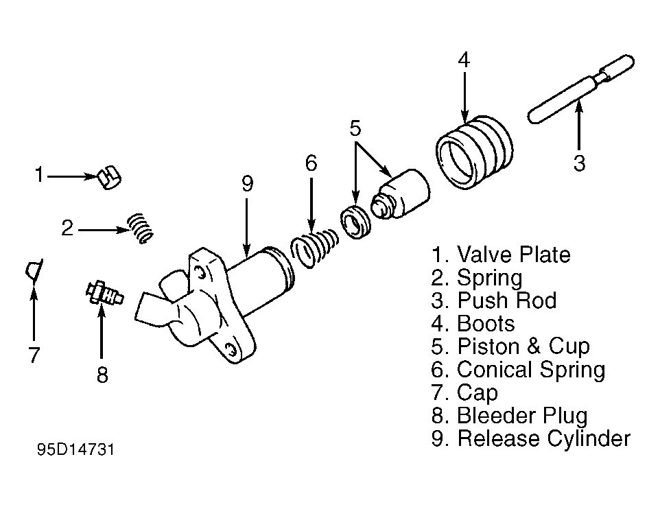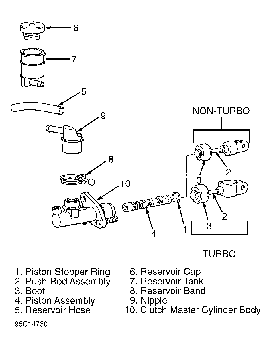 DO NOT disassemble piston assembly. Lubricate push rod assembly, boot and piston assembly using rubber grease. Fill piston assembly using DOT 3 or DOT 4 brake fluid. Adjust push rod assembly to 4.8" (121 mm) before installing. See Fig 1 . For exploded view of clutch master cylinder and clutch release cylinder, see illustrations. See Fig 2 and Fig 3 .