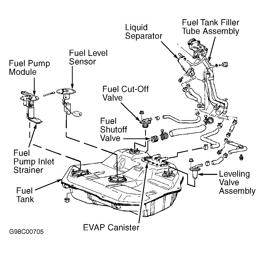 - Fuel pump module is located at passenger's side front corner of fuel tank. See Figure . Release fuel pressure from fuel system. See FUEL SYSTEM PRESSURE RELEASE under FUEL SYSTEM. Remove fuel tank cap to release any residual fuel tank pressure.