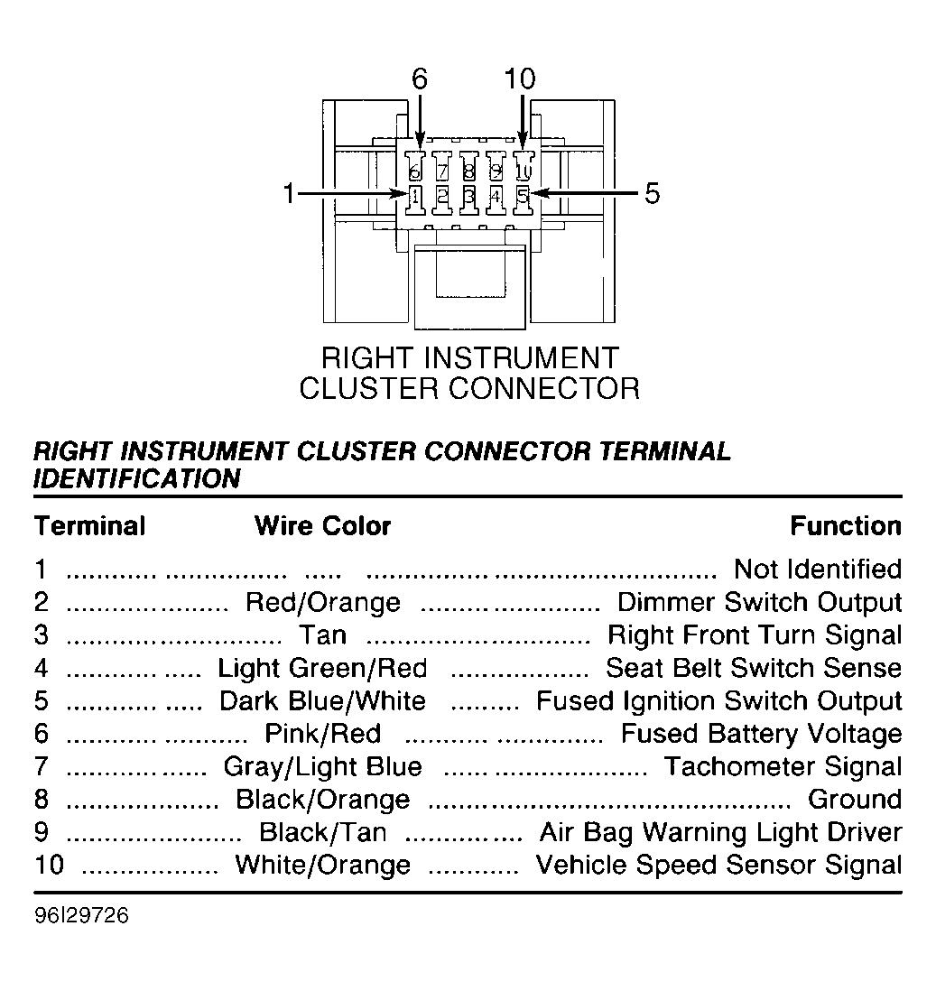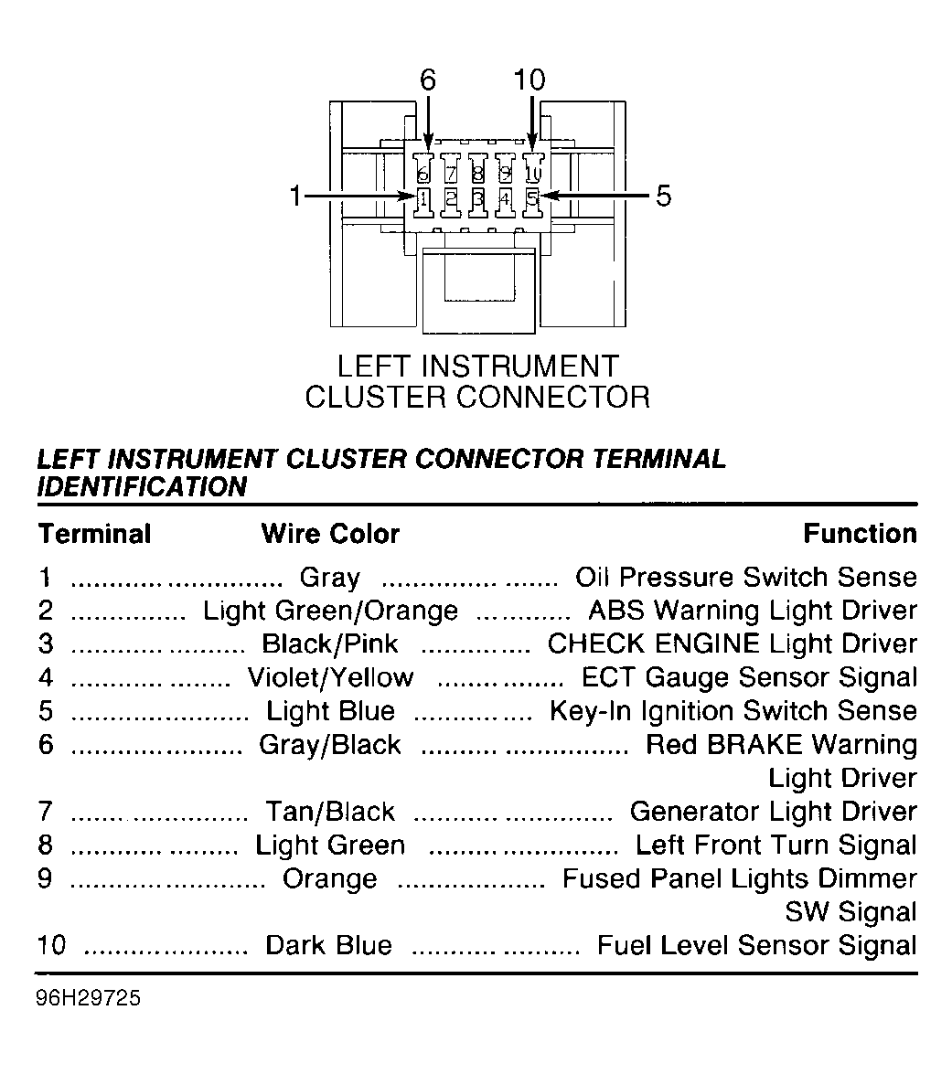 - Turn ignition off. Remove instrument cluster. Using a ohmmeter, check resistance on left instrument cluster connector terminal No. 10 fuel level sensor signal circuit (Dark Blue wire). See Fig 1. If resistance is 5 ohms or more, go to next step. If resistance is less than 5 ohms, repair short to ground on Dark Blue wire. Perform TEST VER-2A .