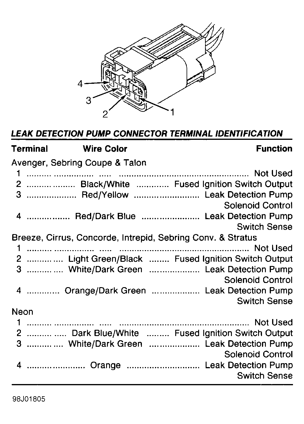 Fig 46: Identifying Leak Detection Pump Connector (Avenger, Breeze, Cirrus, Neon, Sebring Conv., Sebring Coupe, Stratus & Talon)