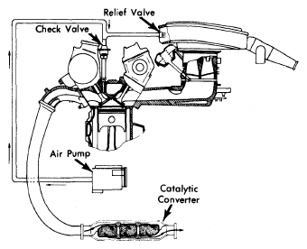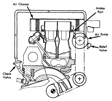 The air pump is a low pressure unit, belt driven by the engine, which uses vanes on its drive pulley as a centrifugal filter. The air delivery line is connected to the check valve. The check valve prevents hot exhaust gases from flowing out through the delivery line and pump in case the pump fails or exhaust gas pressure becomes excessive.