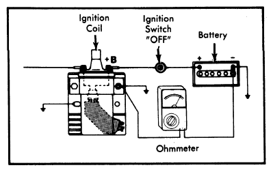 1. Turn ignition switch "OFF". Connect ohmmeter leads to battery ground terminal and ignition coil ground stud. See Fig 1.