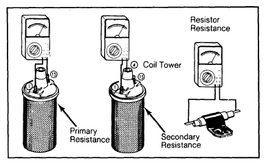 Set an ohmmeter in the low scale. Be sure ignition switch is "OFF". Check resistance of each resistor in the primary circuit. See Figure. Some manufacturers use resistor wires instead of ballast resistors. Most use 2 ballast resistors.