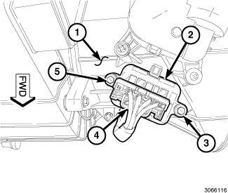 11. Connect the HVAC wire harness connector (2) to the blower motor (4), located on the left side of the HVAC housing (5).