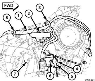 5. Engage the HVAC wire harness to the two plastic retaining brackets (3 and 8).