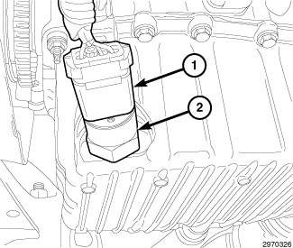 2. Install the oil viscosity sensor (2) to the oil pan and tighten to 13 Nm (115 in. lbs.).