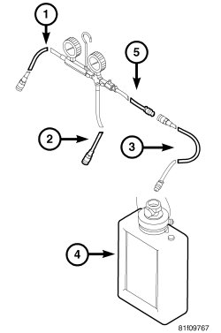 2. Connect special tool Drain Extension Hose 535680 (3) to the Fuel Pressure Gauge Assembly Drain Hose (5).