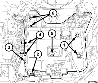 4. Disengage two starter wire harness retainers (6) from the battery tray (3).