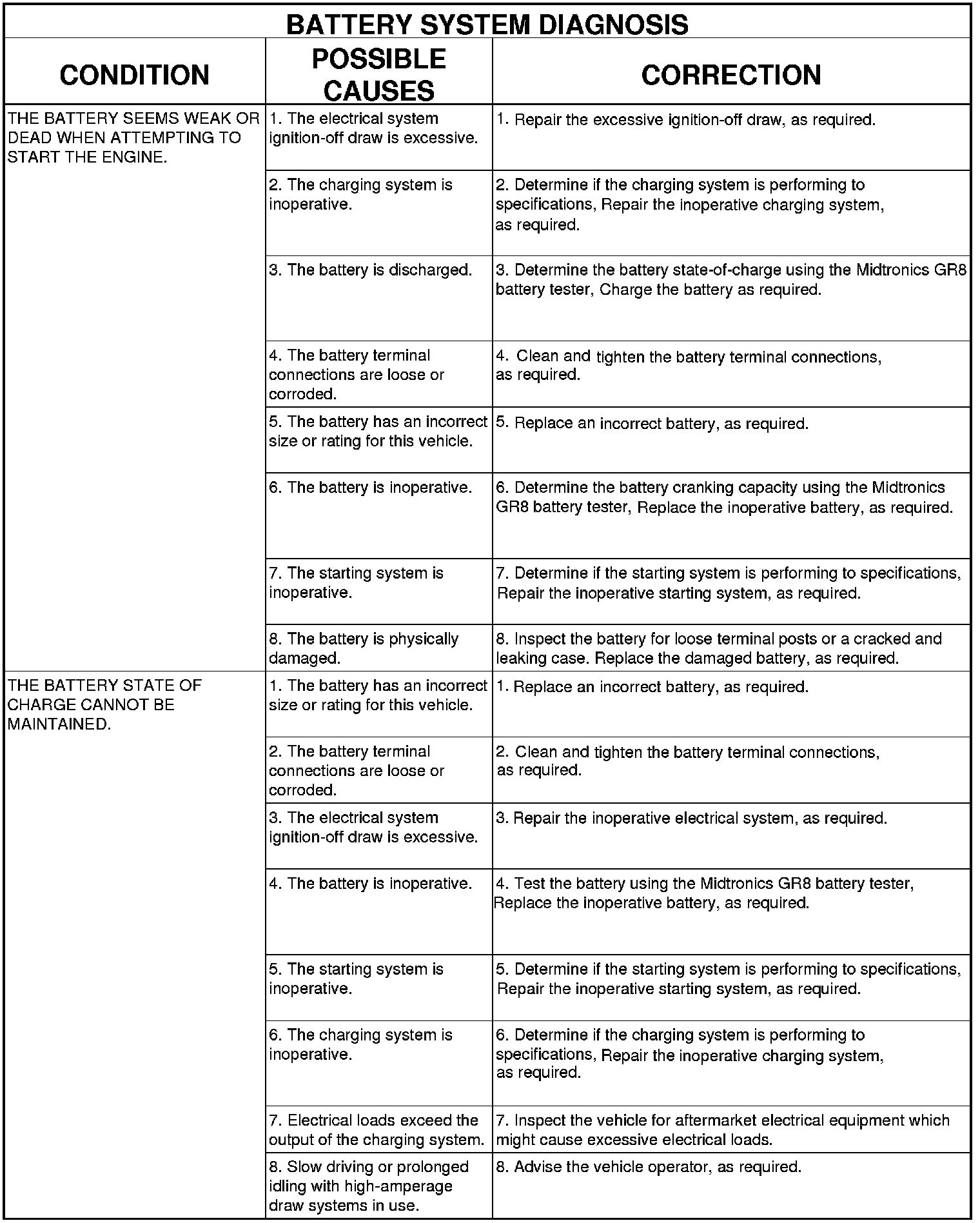 The battery, starting, and charging systems in the vehicle operate with one another and must be tested as a complete system. In order for the engine to start and the battery to maintain its charge properly, all of the components that are used in these systems must perform within specifications. It is important that the battery, starting, and charging systems be thoroughly tested and inspected any time a battery needs to be charged or replaced. The cause of abnormal battery discharge, overcharging or early battery failure must be diagnosed and corrected before a battery is replaced and before a vehicle is returned to service. The service information for these systems has been separated within this service manual to make it easier to locate the specific information you are seeking. However, when attempting to diagnose any of these systems, it is important that you keep their interdependency in mind.