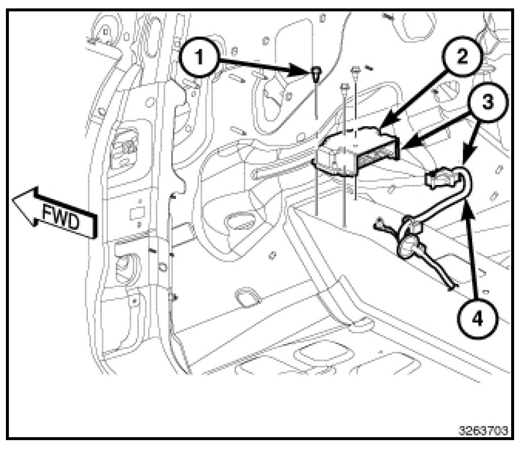 1. Carefully position the Occupant Restraint Controller (ORC) (2) onto the front of the floor panel transmission tunnel, aligning the mounting holes in the ORC to the holes in the floor panel. When the ORC is correctly positioned, the bottom of the housing will fit flush with the floor and the orientation arrow on the label on top of the housing will be pointed forward in the vehicle.