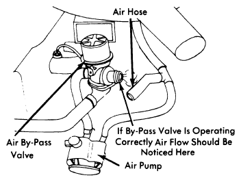 Disconnect air hose from side of air by-pass hose. Start engine, raise speed above 2000 RPM, then release throttle. Air flow should be noticed from valve connection, if by-pass valve is operating properly. See Fig 1.