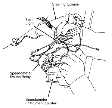 - If accelerator switch is operating properly, remove instrument cluster and attach a test light to speedometer switch relay. See Fig 1.
