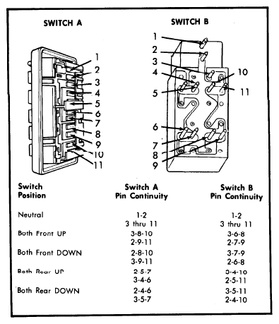 Testing is performed with a self-powered test light or an ohmmeter. Remove switch from vehicle before testing. See Fig 1 for switch terminal identification and continuity charts.
