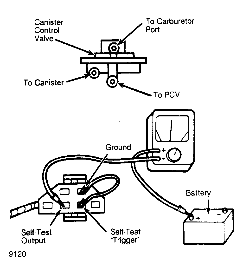 - Turn ignition off. Locate Self-Test connector. Insert jumper wire between ground and "trigger" sockets. Connect positive lead of a needle-type voltmeter to vehicle battery positive terminal, and negative lead to Self-Test output socket. Set voltmeter on 15-20 volt scale. Battery voltage may be shown. See Fig 1 .