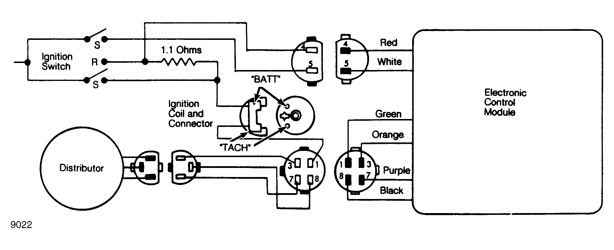The Orange and Purple wires transmit signals to the electronic control module from the reluctor (armature) and pick-up coil (stator) in the distributor.