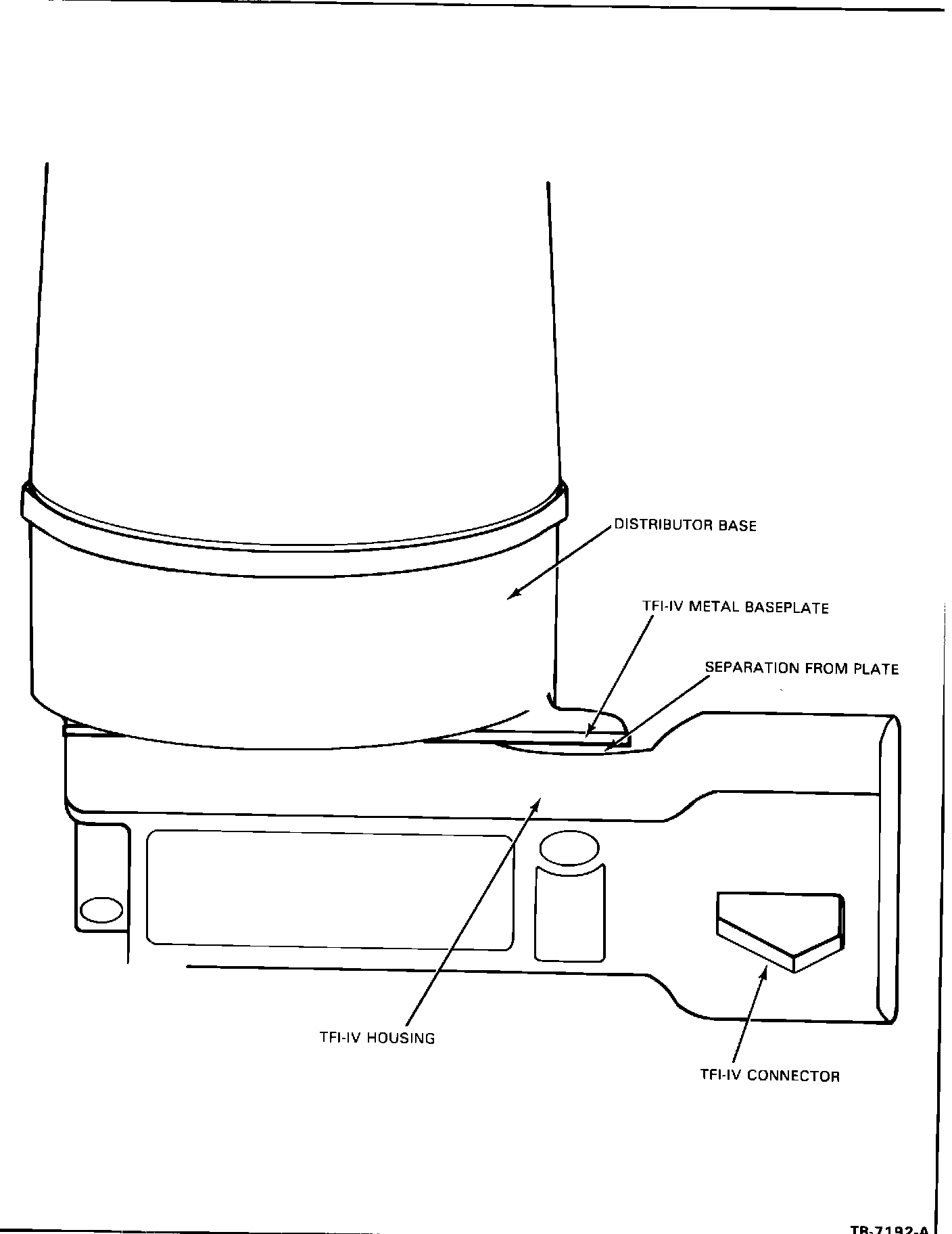 For the above customer concern, visually inspect the T.F.I. ignition module to determine if the plastic housing has partially separated from the metal base plate next to the connector (Figure 7). If the module has separated replace it. Coat the metal base plate of the T.F.I. module with silicon compound (D7AZ-19A331-A or equivalent), approximately 1/32 inch thick. Tighten the mounting screws to 2.5-2.8 N-m of torque. This concern can be caused if the module is used as a handle for adjusting or moving the distributor.