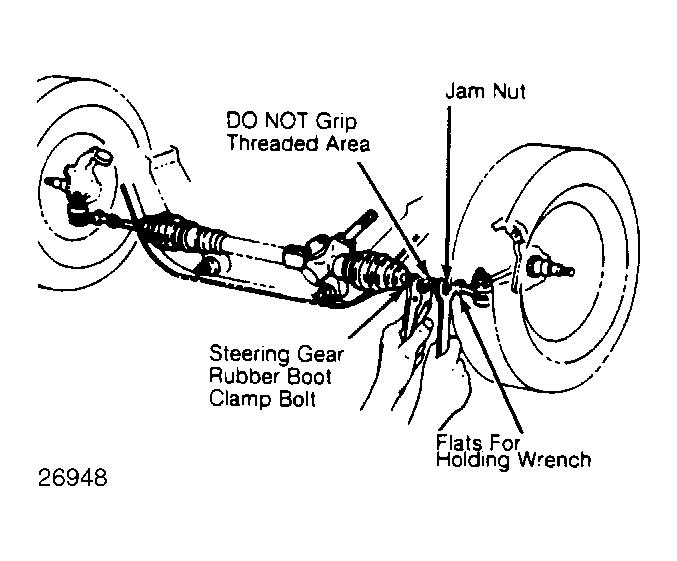 NOTE: When tie rod jam nuts are loosened for adjustment, threads must be cleaned, lubed and tightened. DO NOT grip threads while loosening jam nut or tear rubber boot on tie rod during adjustment.