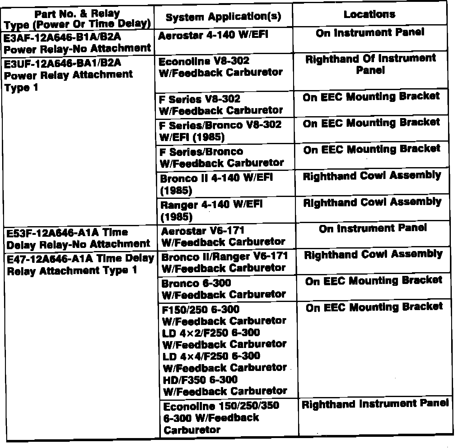 EEC power relays are in parallel with ignition switch and provides power to the EEC module. Power relays also provide reverse battery protection and increased load handling to improve ignition switch reliability. Refer to Figs. 12 & 12a, for EEC-IV power relay type, location and model/engine applications.