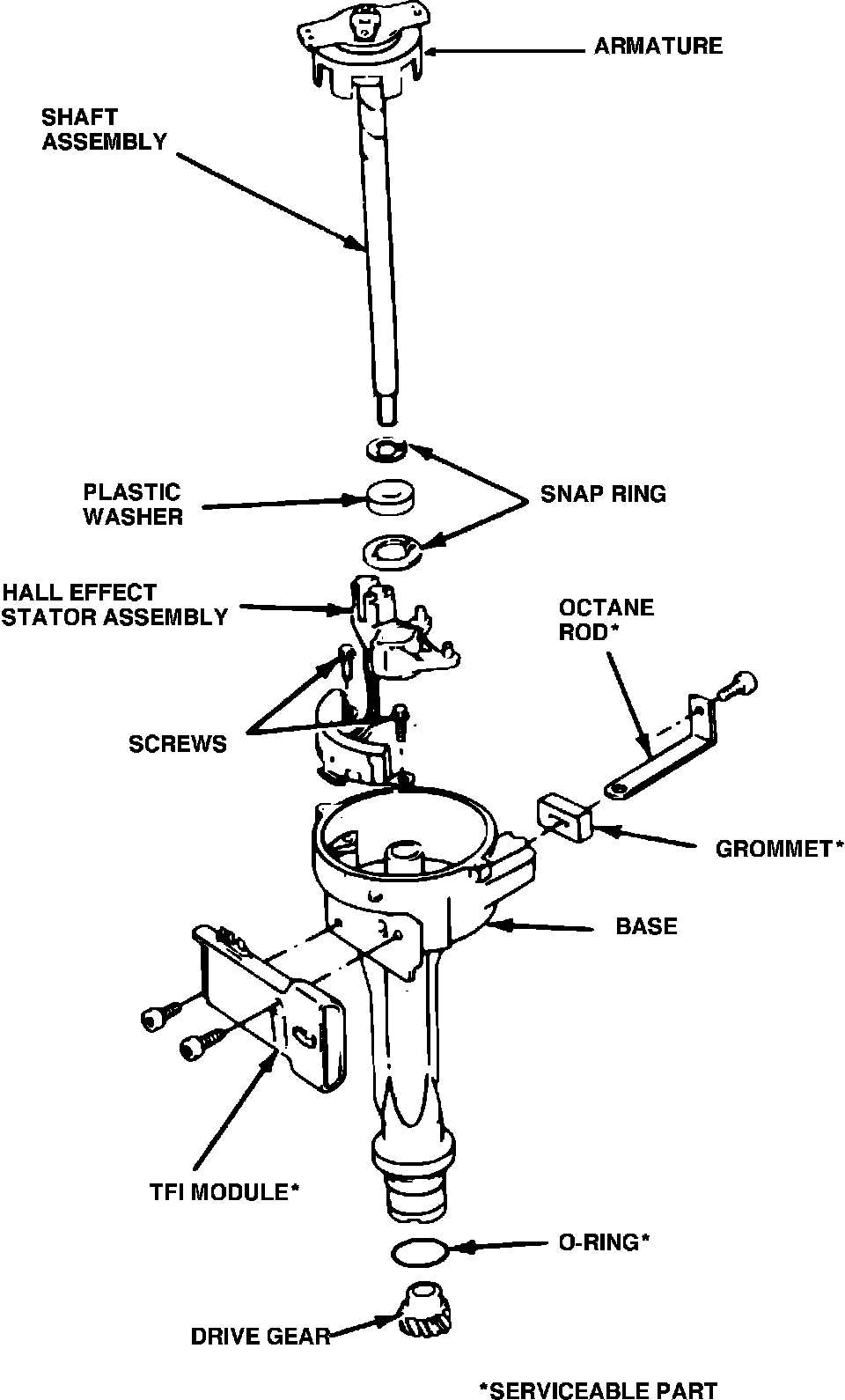 7. Place TFI module on distributor base mounting flange. Carefully position TFI module assembly toward distributor bowl and securely engage 3 distributor connector pins.