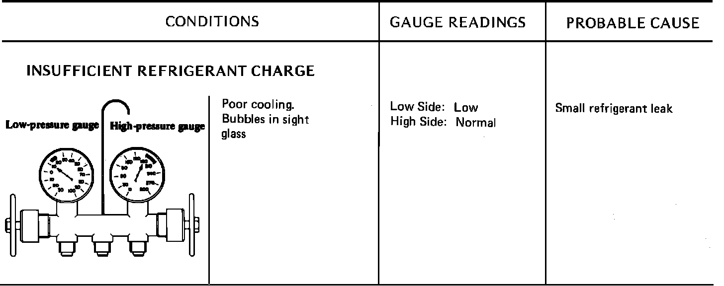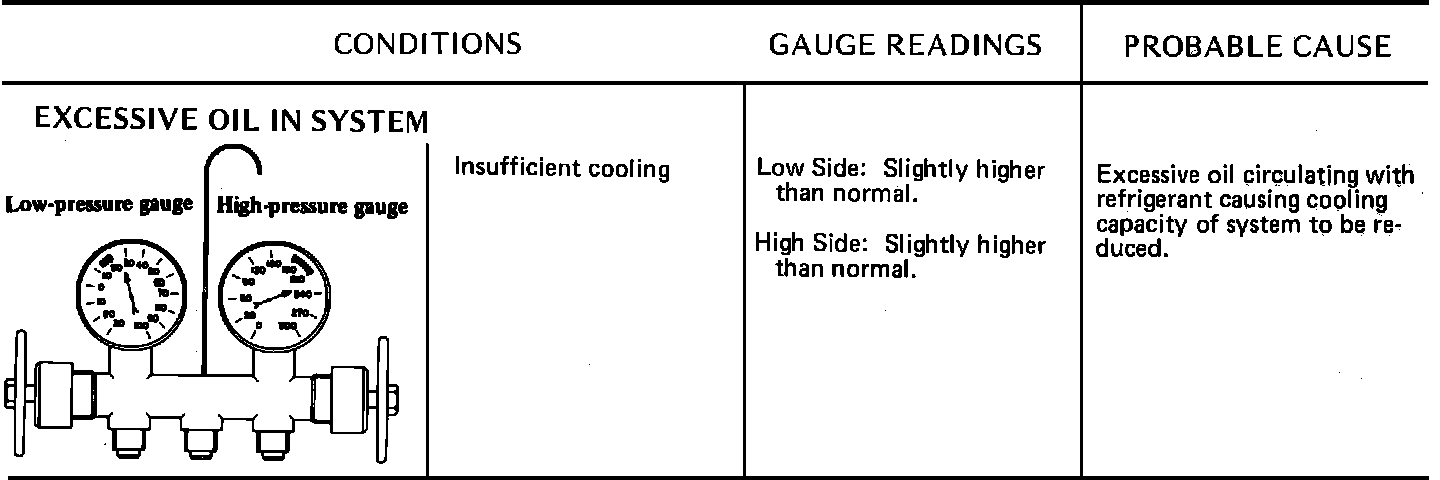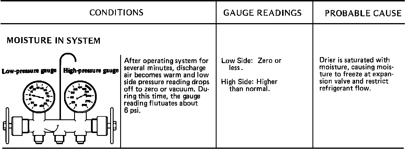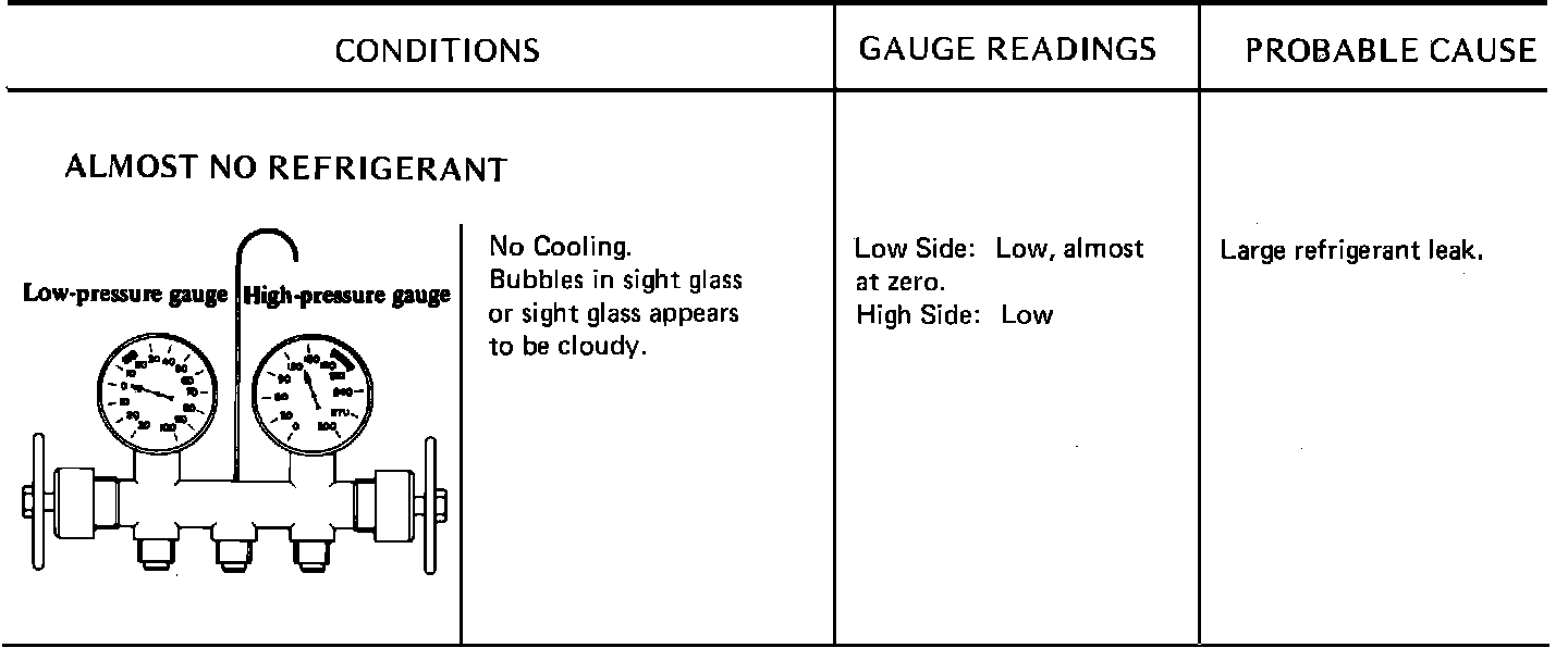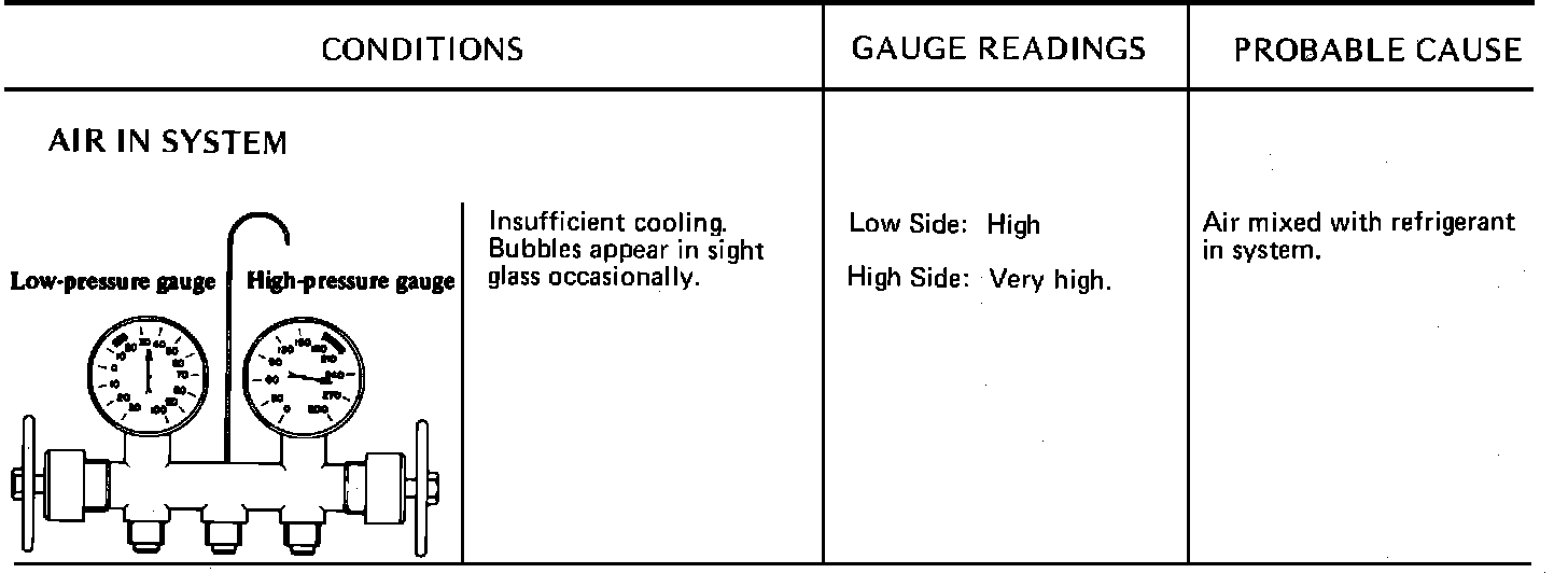 Due to the different types of models and systems the typical pressure gauge indications shown in this section should be used as a guide only. Refer to "Diagnosis and Testing Procedures", "System Diagnosis and Performance Test" for the particular model being tested. When indications other than normal are encountered, these typical indication charts will assist in diagnosing the refrigerant system. It should be noted that pressures may vary slightly above or below due to changes in ambient temperature and relative humidity.