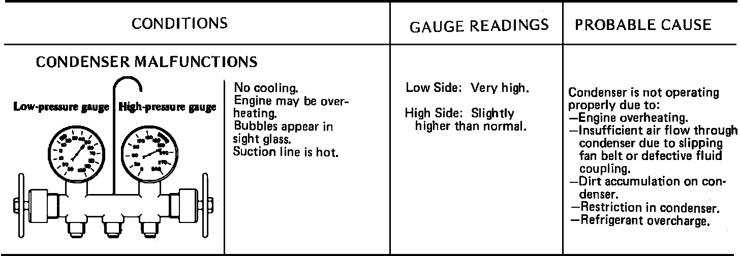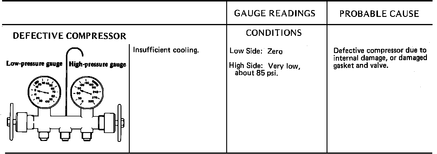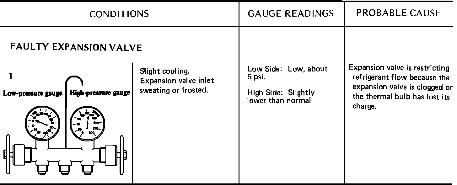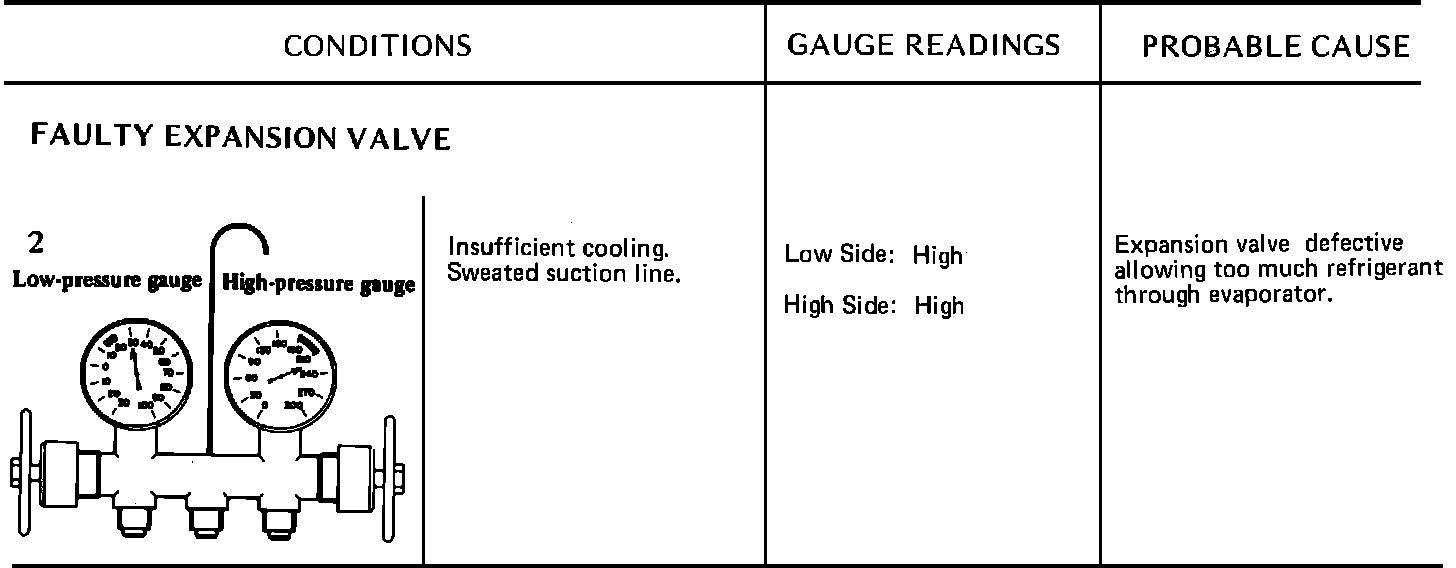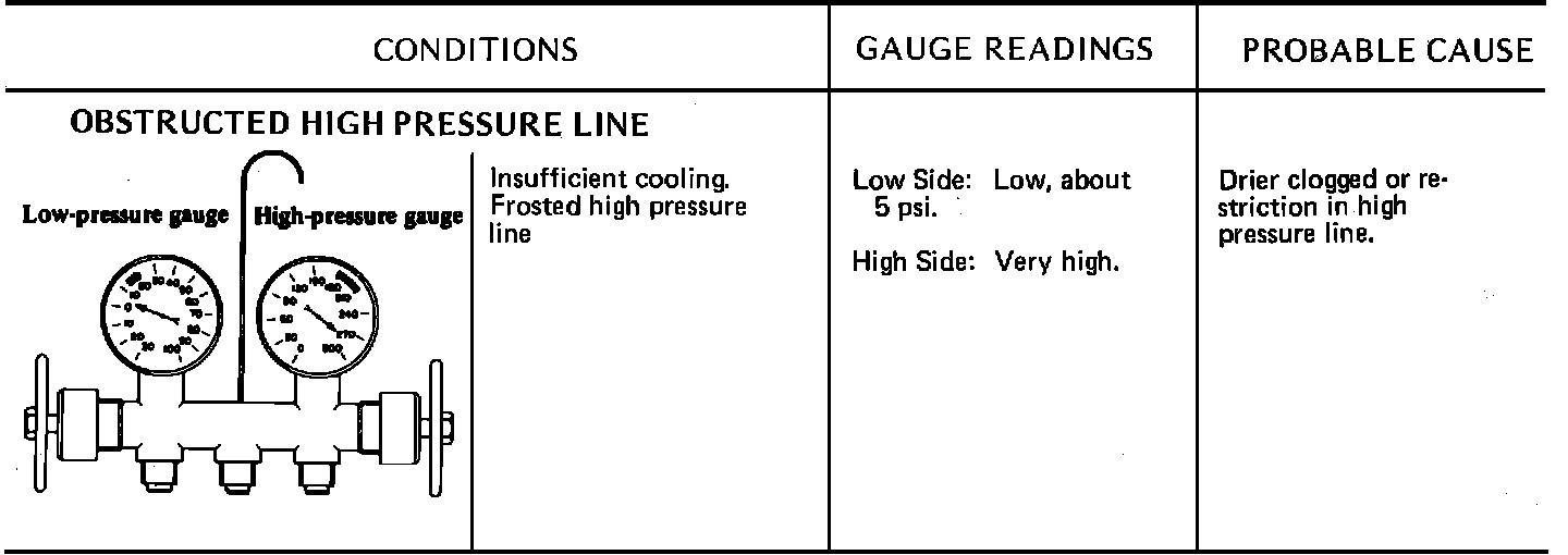 Due to the different types of models and systems the typical pressure gauge indications shown in this section should be used as a guide only. Refer to "Diagnosis and Testing Procedures", "System Diagnosis and Performance Test" for the particular model being tested. When indications other than normal are encountered, these typical indication charts will assist in diagnosing the refrigerant system. It should be noted that pressures may vary slightly above or below due to changes in ambient temperature and relative humidity.