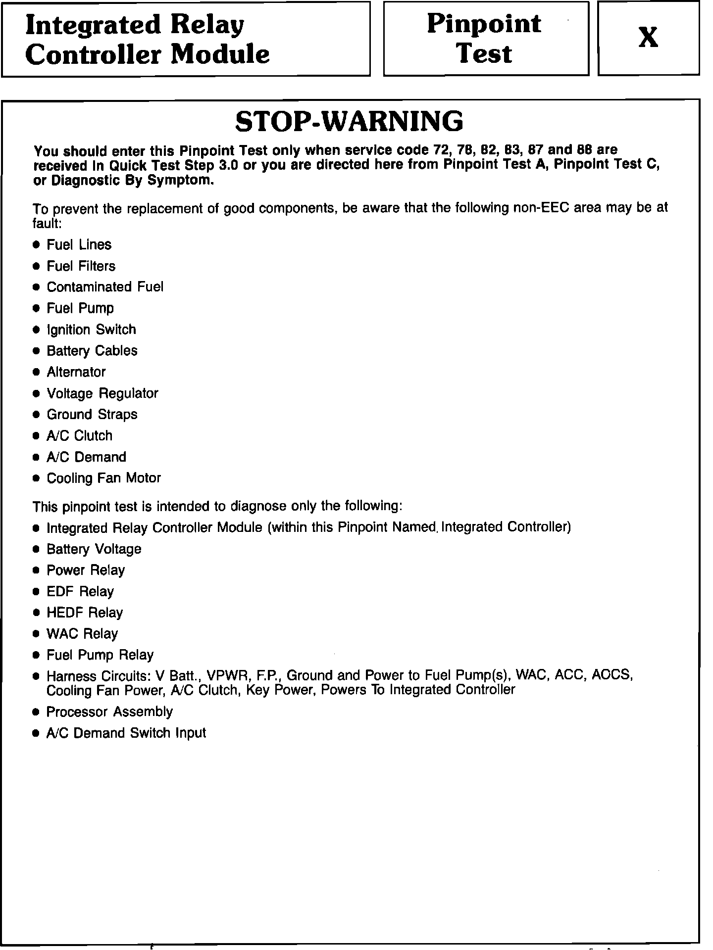 Home >> Ford >> 1987 >> Taurus L4-153 2.5L HSC >> Repair and Diagnosis >> Powertrain Management >> Computers and Control Systems >> Testing and Inspection >> Pinpoint Tests >> X - Integrated Relay Control Module >> X - Stop Warning