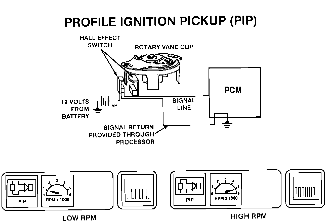 The PIP signal is created in the Hall Effect and Stator assembly and indicates crankshaft position and engine RPM Fig. 21. The PIP signal is fed to both the TFI module and the ECA.