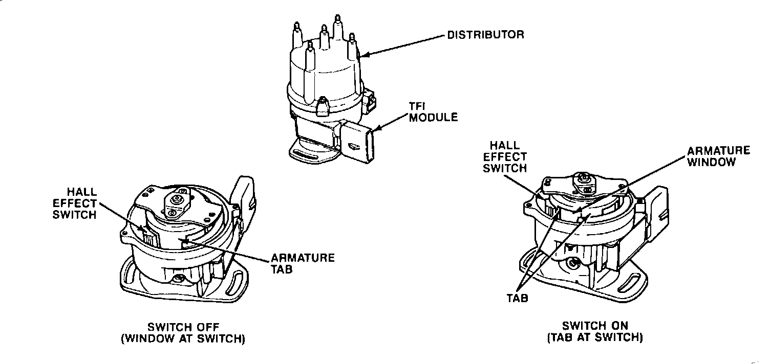 In other words when one of the windows or openings is in the gap between the Hall device and the permanent magnet, the field stays strong and the voltage is high since the magnetic path is complete from the magnet, through the Hall device, and back to the magnet. In this case the switch is off and the Hall Effect does not send a signal. When the TAB enters the gap, the armature cuts off the magnetic path to the Hall device and its voltage drops. In this case the switch is on and the Hall Effect device sends a signal. The signal is switched On and Off as long as the armature is rotating (distributor is turning) and opening and closing the magnetic path.