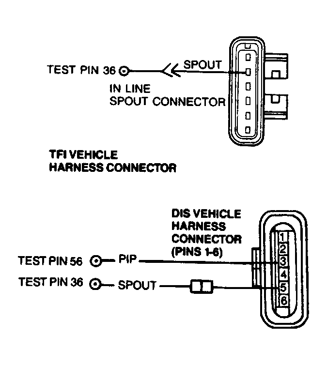 - Checking SPOUT Circuit For Continuity. Turn key off and wait 10 seconds. Install breakout box. Disconnect ECA and TFI module. With DVOM set on 200-ohm scale, measure resistance between test pin No. 36 (SPOUT) at breakout box and SPOUT pin at TFI harness connector. See Fig 2 . If reading is greater than 5 ohms, repair open circuit. Connect SPOUT connector and check timing as described in step 1). If reading is 5 ohms or less, go to next step.