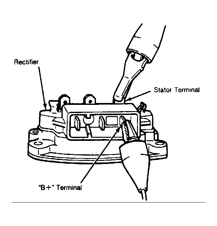 - Remove rectifier from alternator. Adjust ohmmeter to x1 scale. Place one lead on one of rectifier "BAT" blade terminals. Place other lead on each of the 3 stator terminals. See Fig 1 . Reverse leads and repeat test. Note readings in both directions.