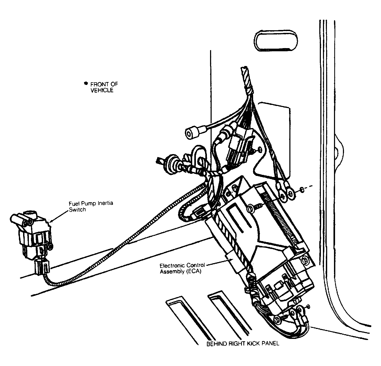 | Electronic Control Assembly (ECA) Module | Behind right kick panel. See Figure. | |
